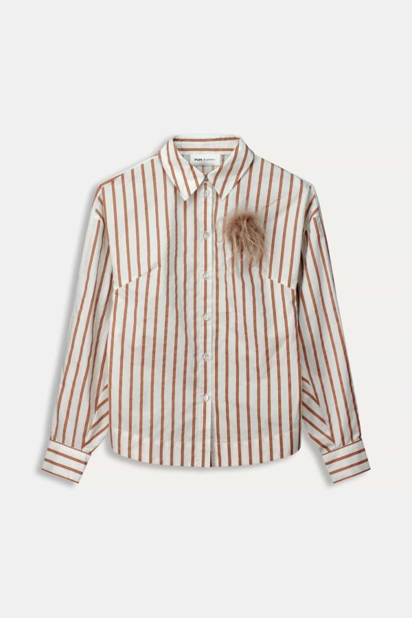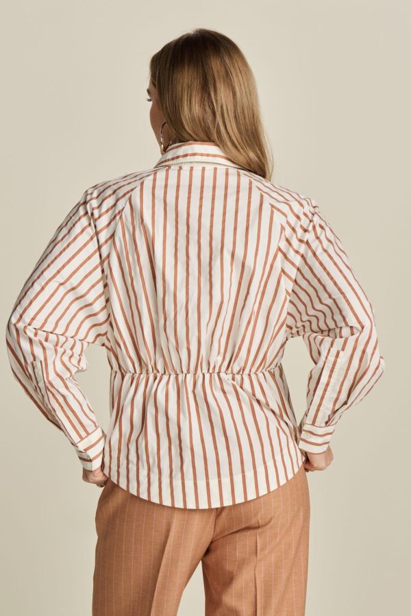 Deze bruin-wit gestreepte blouse is gemaakt van 100% katoen. De blouse is voorzien van een afneembare verenbroche en is afgewerkt met een elastisch detail op de rug.