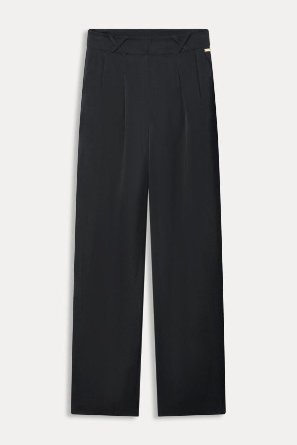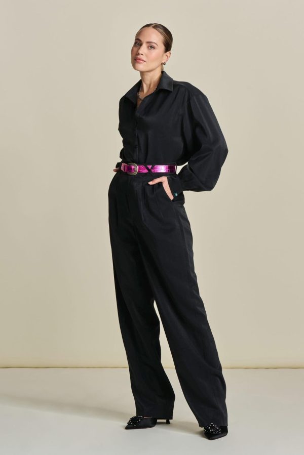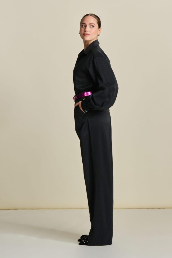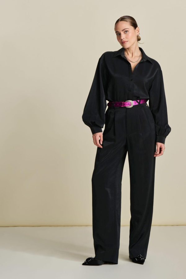Deze zwarte wijde broek, met een subtiele glans, is perfect aansluitend in de taille en heeft wijd uitlopende pijpen voor een elegante look. Met twee steekzakken aan de voorkant en een rits met hook and eye sluiting biedt deze broek zowel stijl als comfort.
