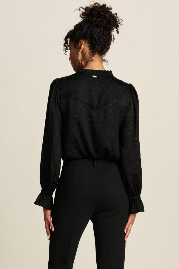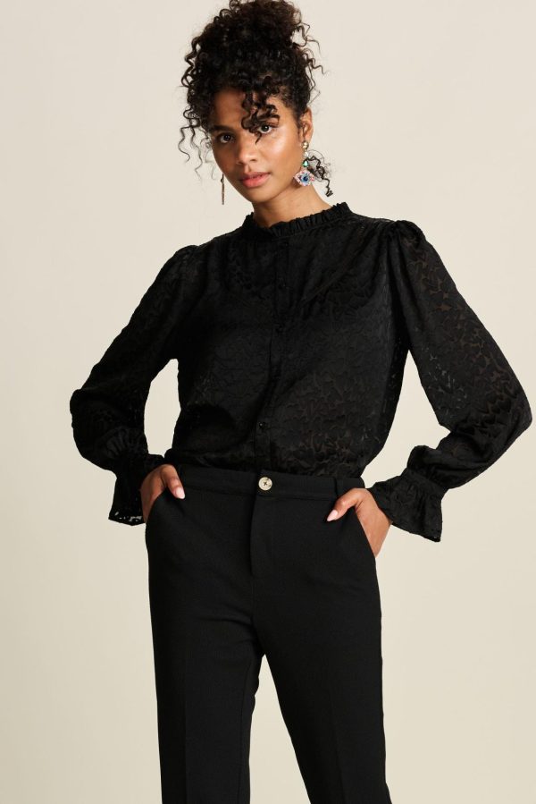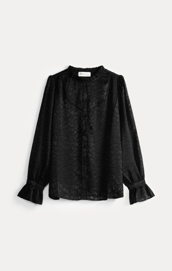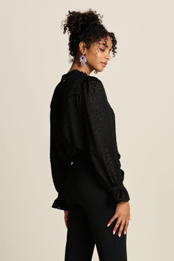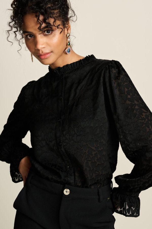 Deze prachtige zwarte blouse is gemaakt van duurzaam viscose en heeft een semi-transparante look. In de stof zijn een hartenprint geweven. De manchetten zijn wijd uitlopend en langs het opstaande kraagje zit een ruffel. Op de borst zit een opengewerkt detail.