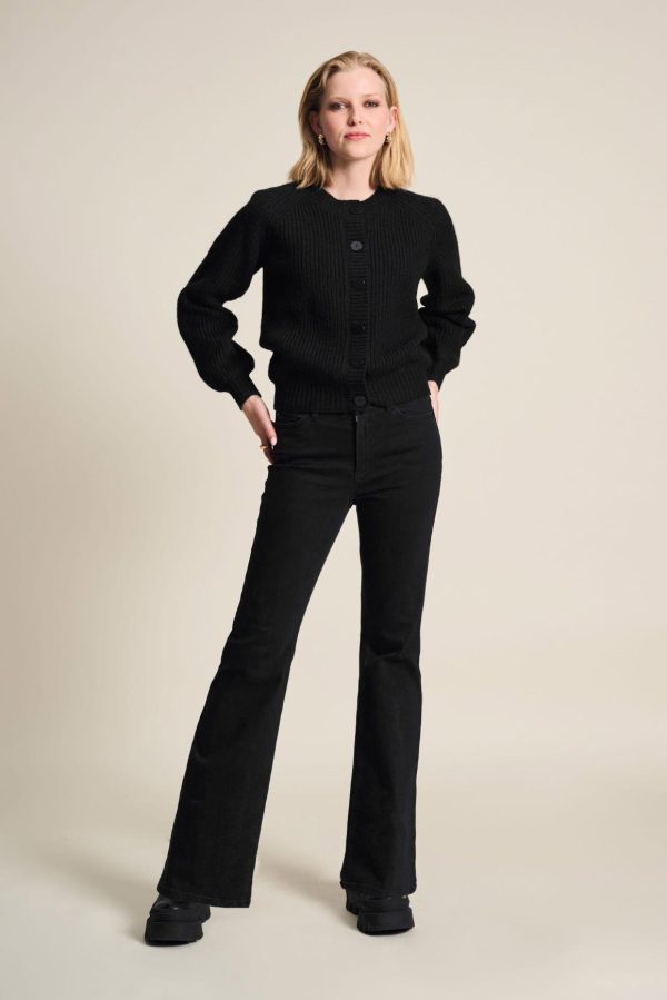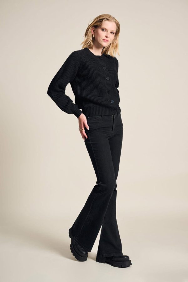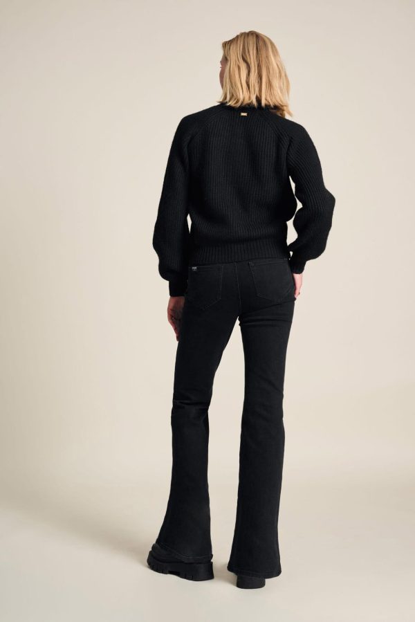 Deze zwarte flared jeans met wassing heeft een handige knoop- en ritssluiting. De tijdloze pasvorm gecombineert met de stoere uitstraling zorgt voor een stijlvolle look.