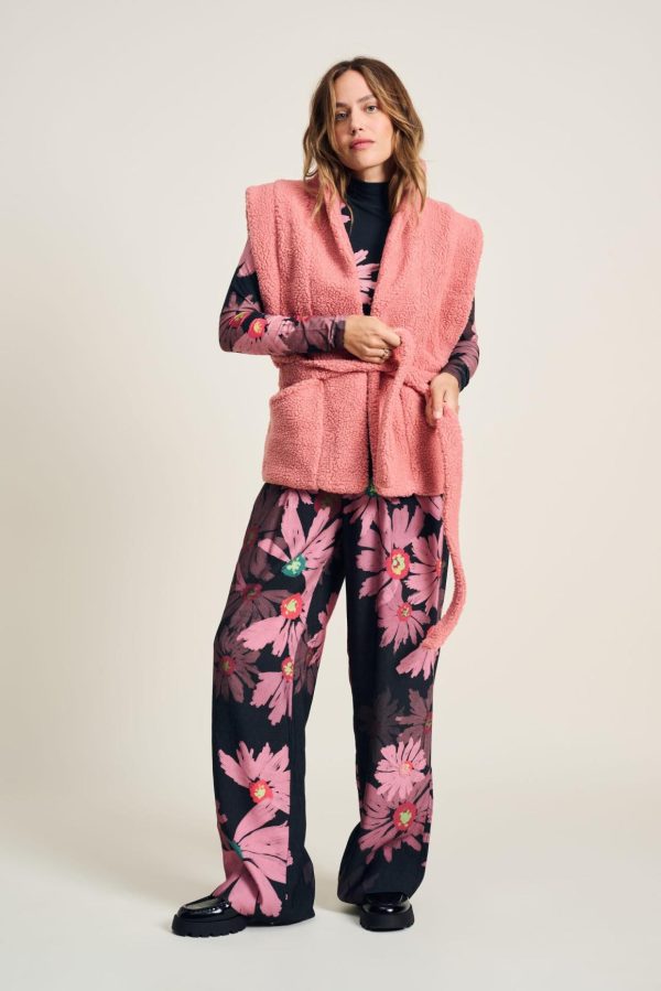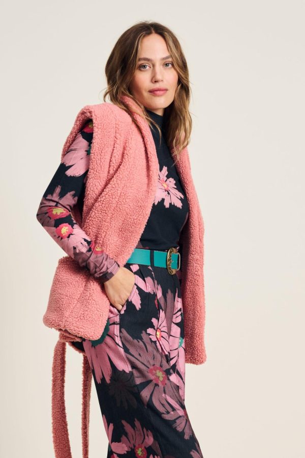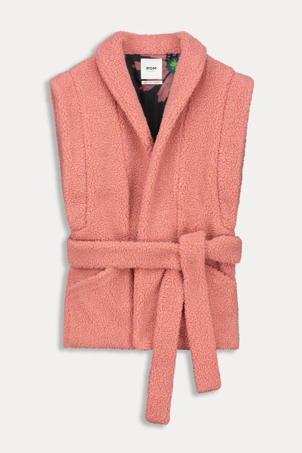 Dit roze teddy gilet, gemaakt van zachte stof, heeft een handgemaakte print in de voering en een afneembare broche. Perfect voor een stijlvolle en comfortabele look.