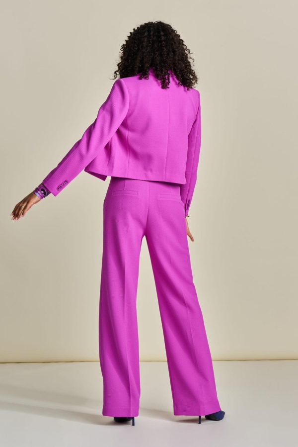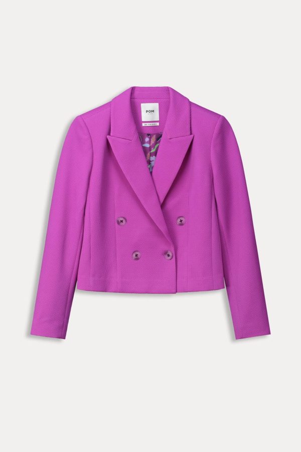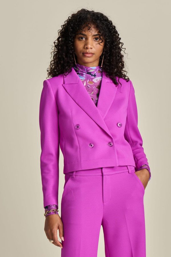 Deze korte roze blazer is een must-have in je garderobe. De blazer is gemaakt van onze populaire pique stof met subtiele wafelstructuur en gevoerd met een kleurrijke print. Combineer dit jasje met de bijpassende Cactus pink wideleg of flared broek. De blazer is geproduceerd met een duurzaam materiaal van 90% polyester.
