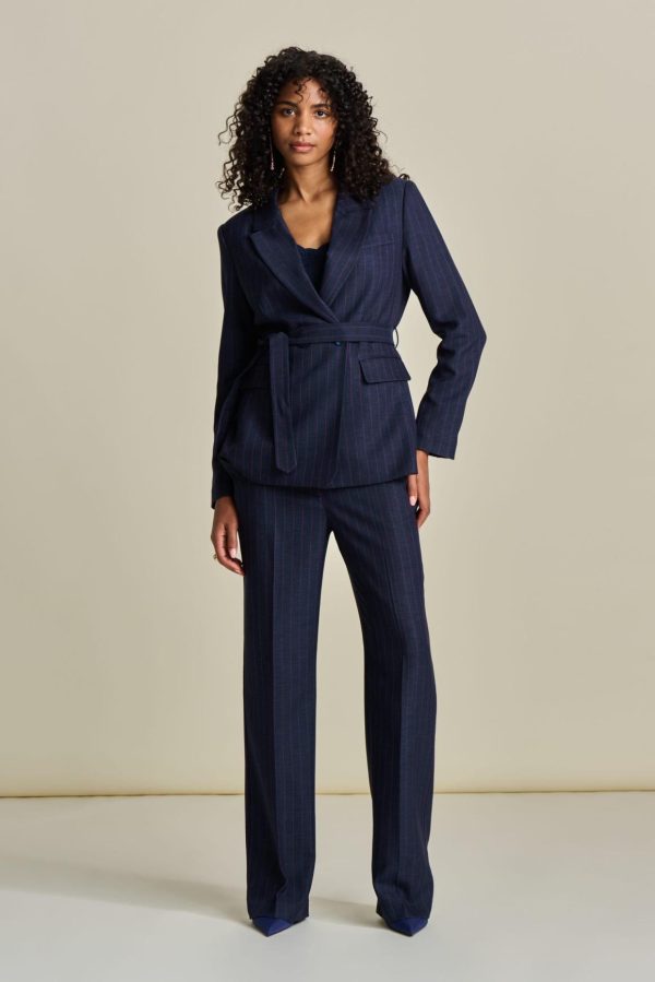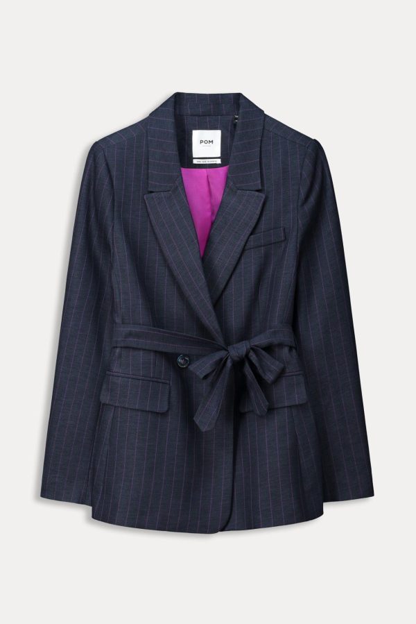 Ontdek deze blauwe blazer, een stijlvolle toevoeging aan je garderobe. De paarse strepen op de blazer geven een elegante uitstraling aan het jasje. De blazer is voorzien van een ceintuur. Combineer deze blazer met de bijpassende broek voor de complete look.