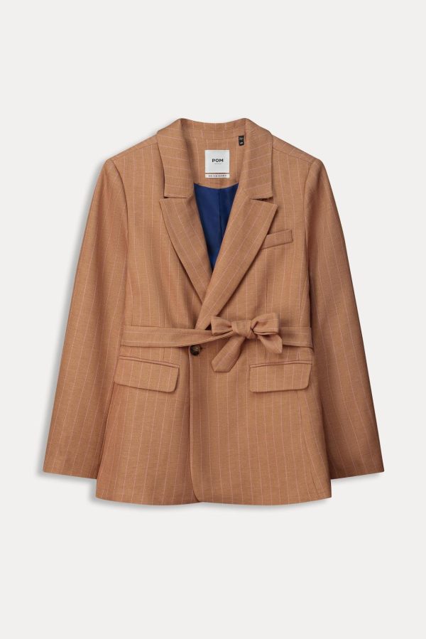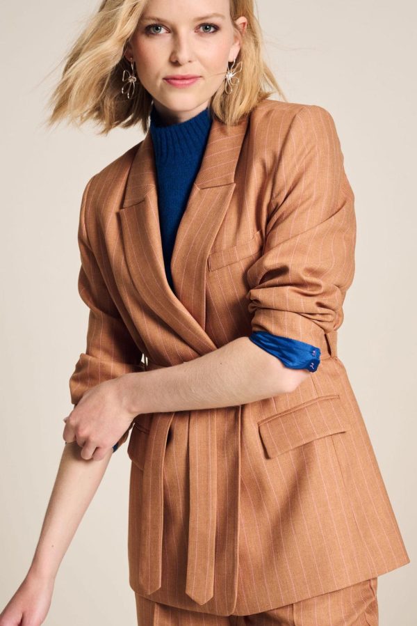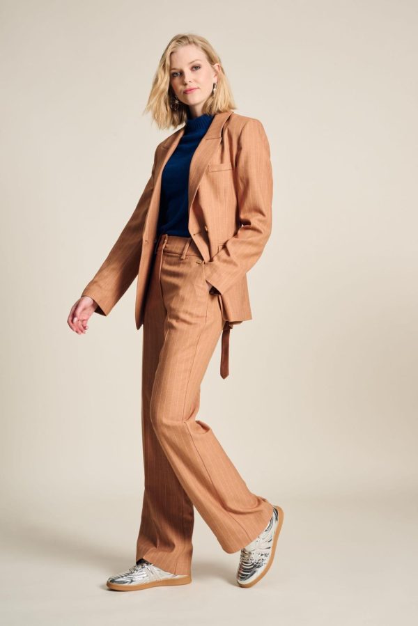De bruine blazer maakt je outfit helemaal af! De blazer heeft roze, ingeweefde strepen en een afneembaar strikceintuur. Maak de look helemaal af met de bijpassende pantalon!
