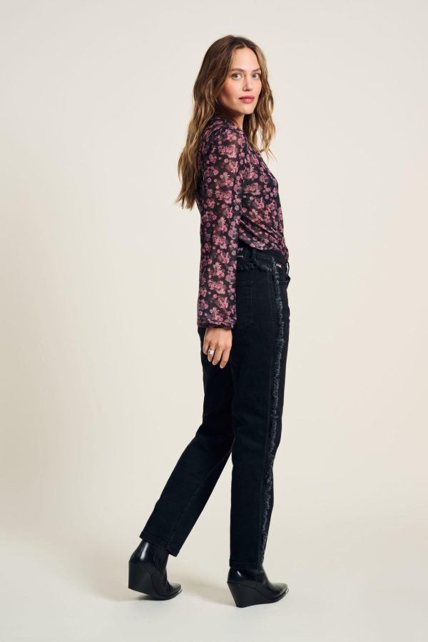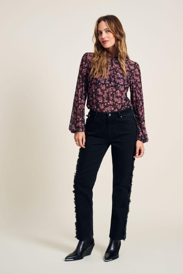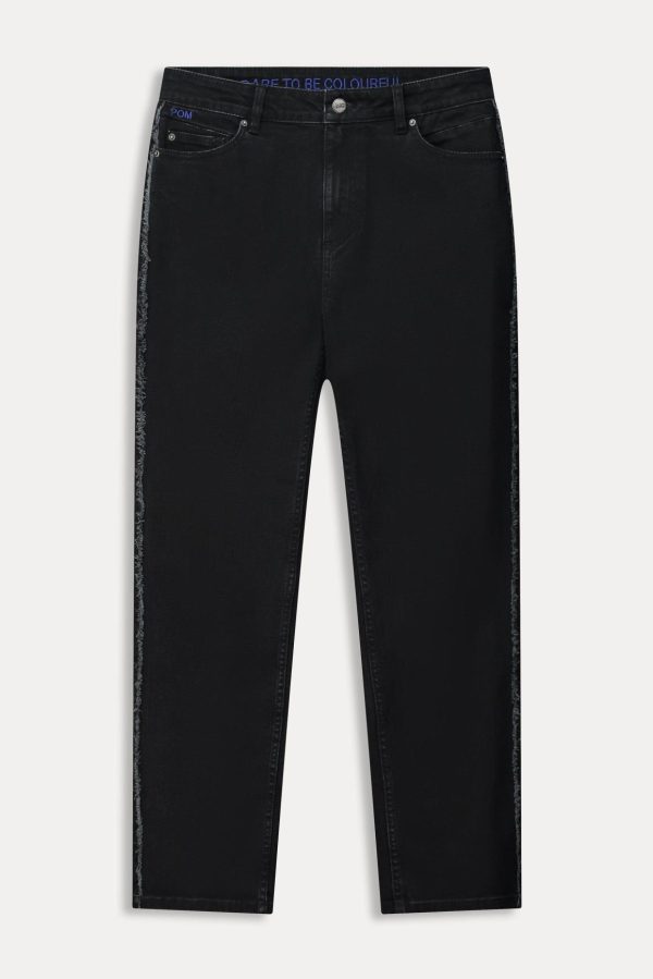 Deze zwarte jeans met toelopende pijpen heeft twee steekzakken aan de voorkant en een rits- en knoopsluiting. Aan de achterkant zijn twee opgezette zakken en de raw edges langs de zijnaad geven een stoere uitstraling.