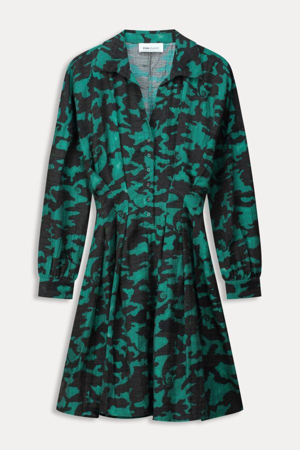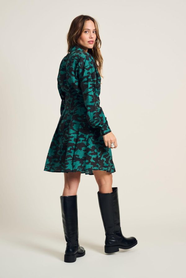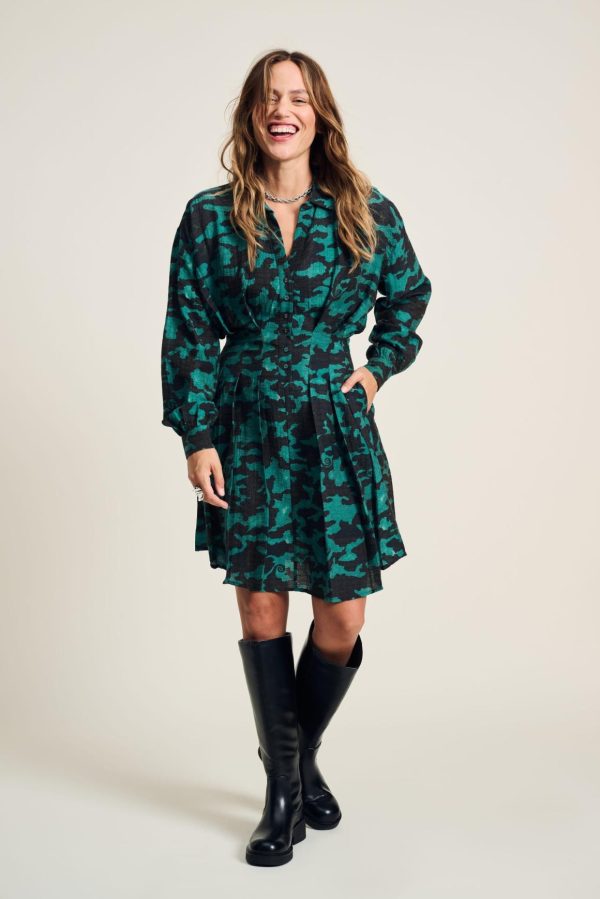Deze groene jurk heeft een prachtige handgeschilderde een camouflageprint. De print is geïnspireerd op kameleons, die subtiel terug te zien zijn in de print. De jurk is getailleerd bij de middel. De stof van de jurk is gemaakt van 83% TENCEL ™ Lyocell, waardoor dit item ‘more sustainable’ is.