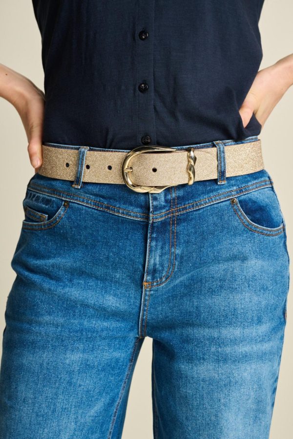 Riem Stardust Gold geeft jouw outfit de finishing touch. De gouden glitter riem heeft een unieke glanzende gouden gesp. Stardust Gold is ‘more sustainable’ door het duurzame leer afkomstig uit Nederland. Draag deze riem op een van onze Festive jurken voor een goede finishing touch. Liever een stoere look? Combineer de riem dan met een van onze jeans. Pasvorm: De riem is 4 cm breed. De riem is verkrijgbaar in 3 lengtes: 75 cm (maat 34/36), 85 cm (maat 38/40) en 95 cm (maat 42/44). De lengte van de riem wordt gemeten tot het middelste gaatje.