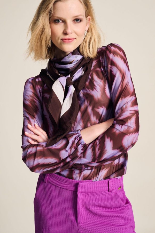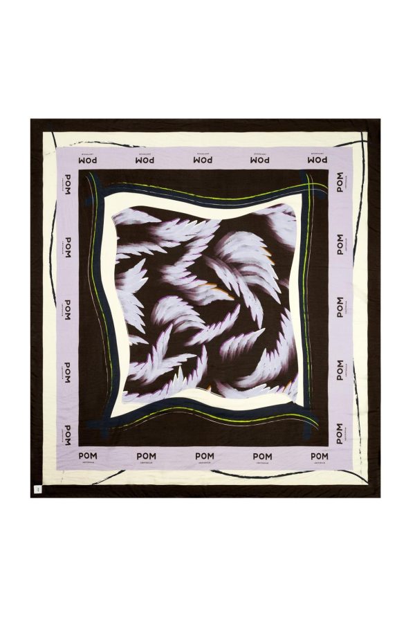 Ontdek deze prachtige paarse sjaal met een verenpatroon, geïnspireerd op de vleugels van vogels, gemaakt van 100% zijde.