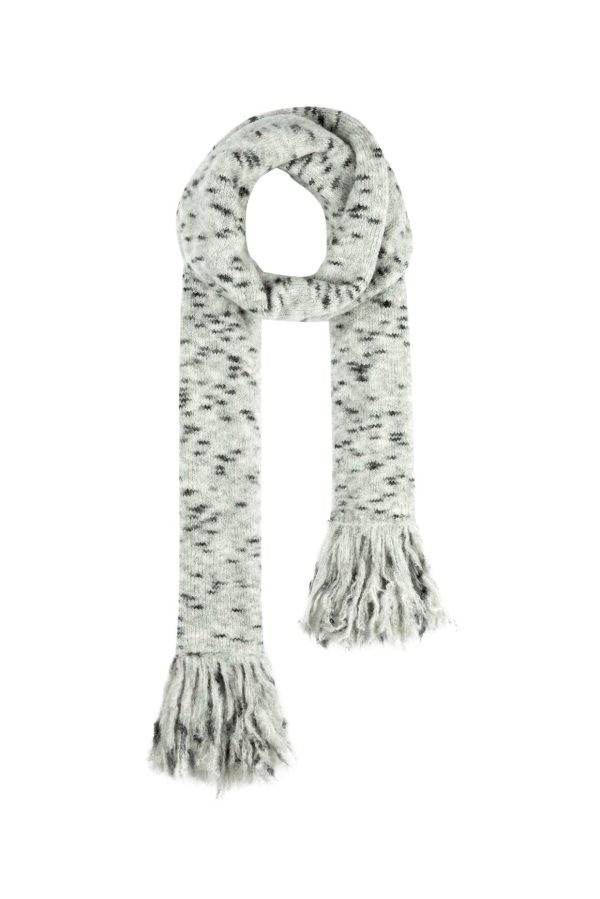 Ontdek deze grijze sjaal met subtiel patroon en charmante franjes aan de onderkant! Bevat wol voor extra warmte tijdens koude dagen. Combineer met de bijpassende trui voor de complete look.
