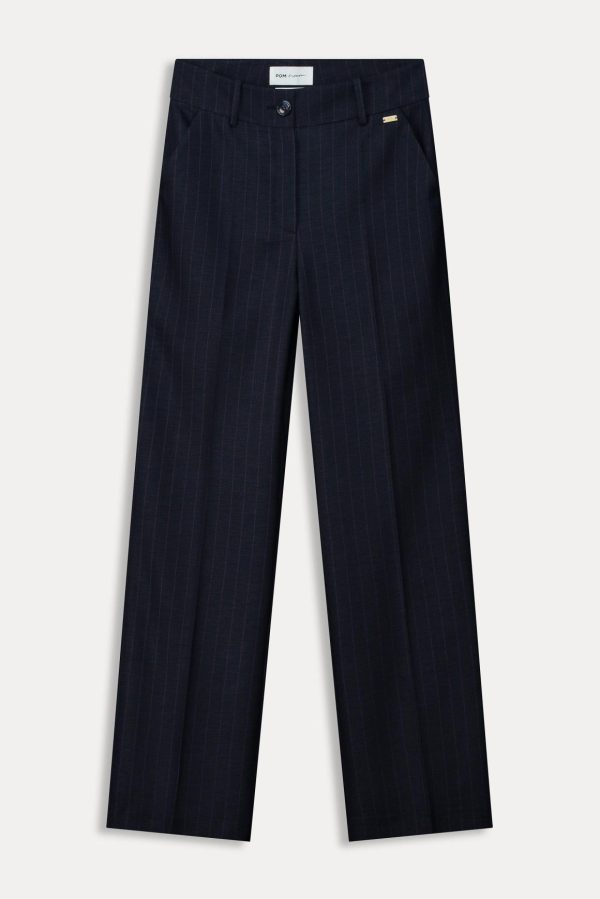 Ontdek deze veelzijdige blauwe broek met een subtiel accent van paarse, ingeweven strepen. De perfecte aanvulling op elke garderobe. Maak de look af met de bijpassende blazer!
