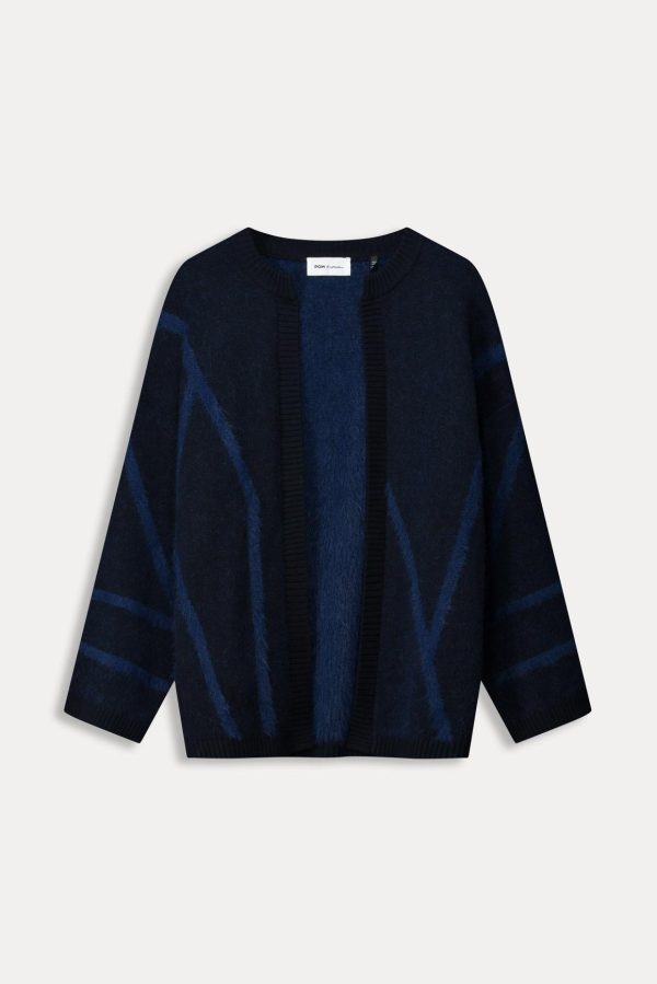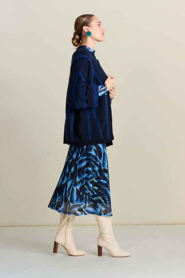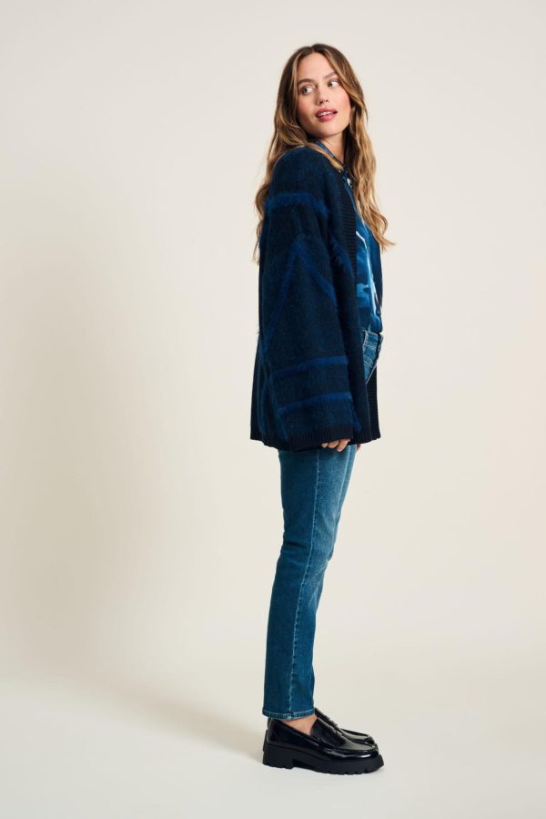 Dit stijlvolle blauwe vest heeft een asymmetrisch strepenpatroon. Deze cardigan voelt heerlijk zacht en is erg comfortabel. Het vest heeft een elegante broche in de vorm van een schelp.